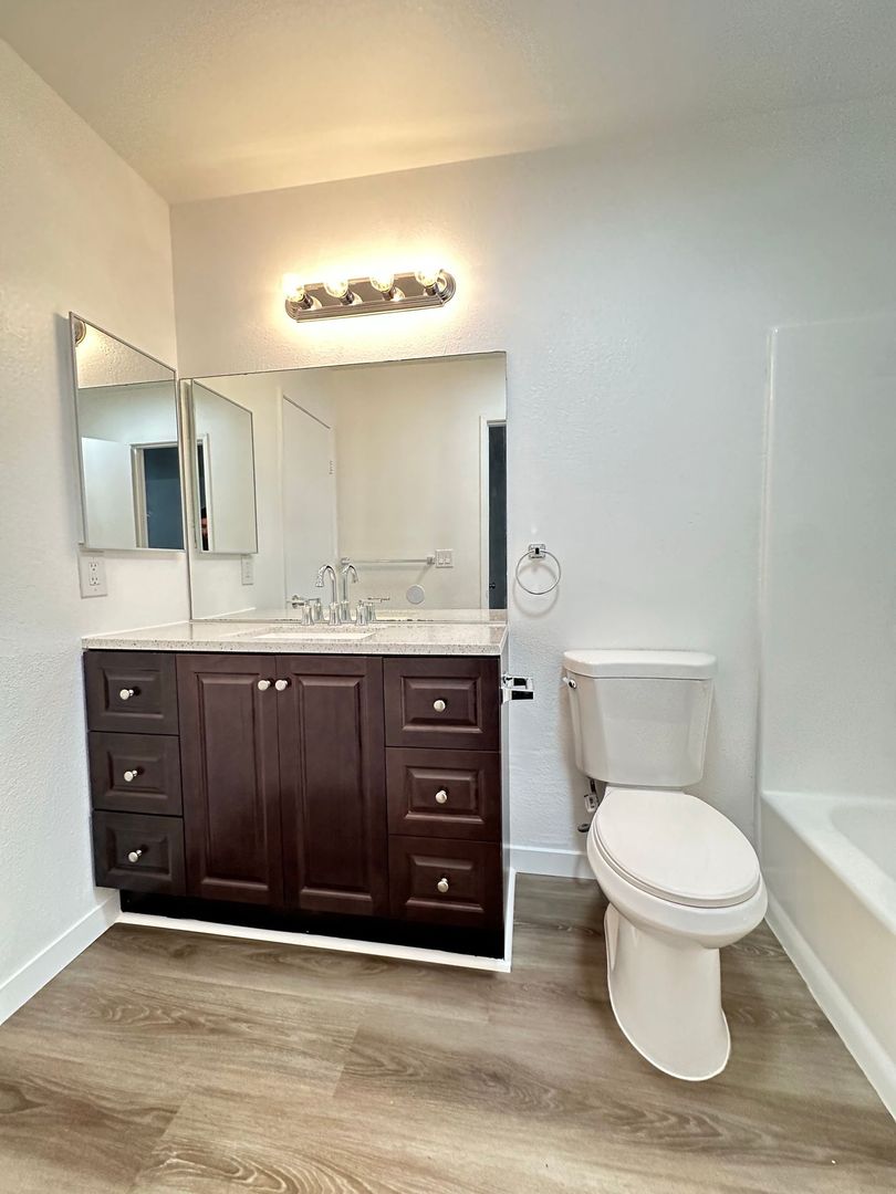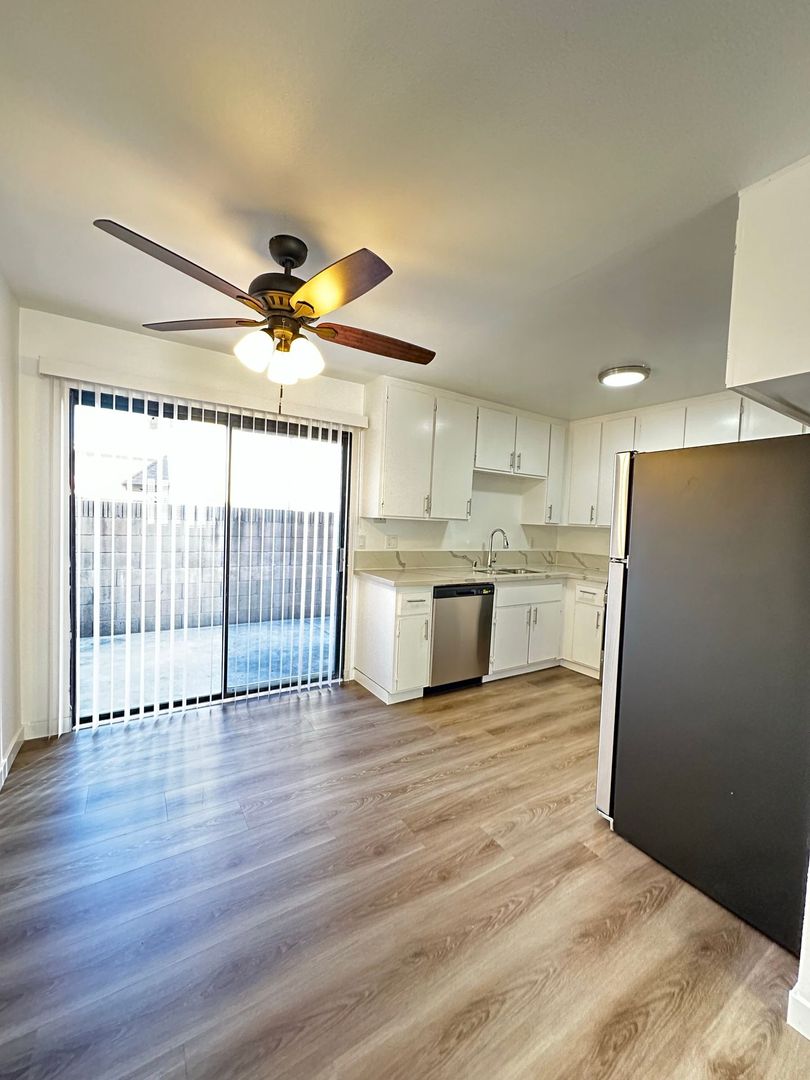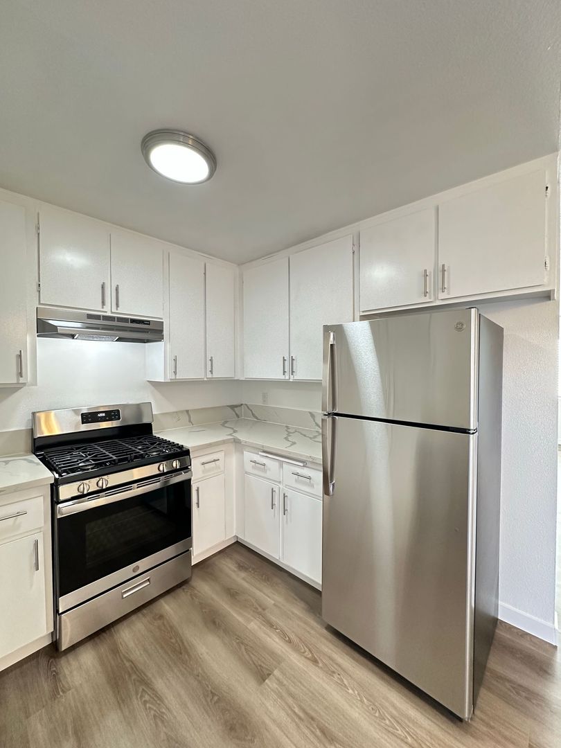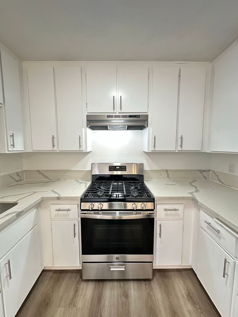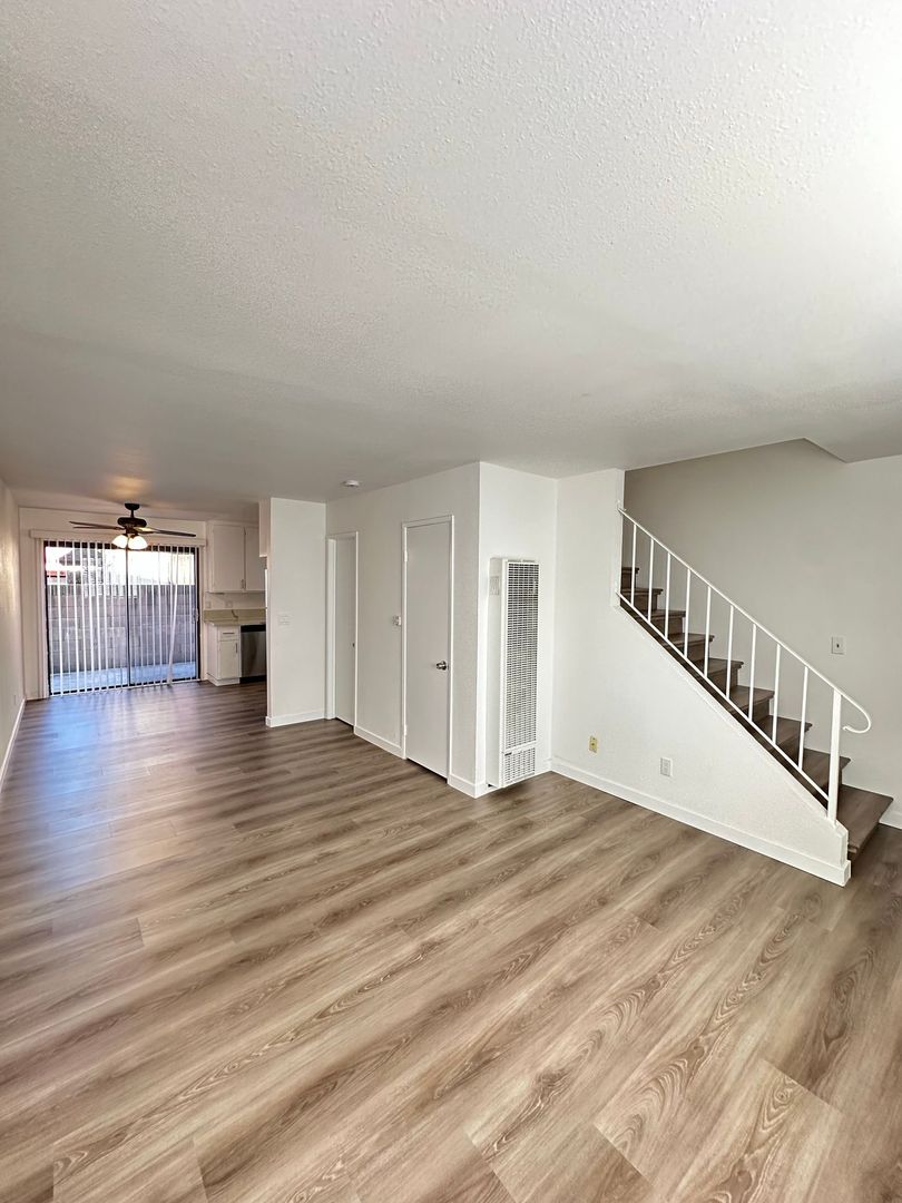 We are proudly offering for rent this completely remodeled 2 bedroom 1.5 bath townhome apartment in the city of Paramount. This approximately 1000 square foot apartment has been gorgeously remodeled with new beautiful kitchen cabinets and quartz countertops, vinyl plank flooring, new paint, a 1 car garage, stunning bathroom vanities with quartz countertops, stainless steel kitchen appliances (stove, dishwasher, and refrigerator), a large patio, and laundry hookups. The owner pays for water/trash. This is a gorgeous apartment located near the 105, 710, and 605 freeways. The apartment requires renters' insurance.